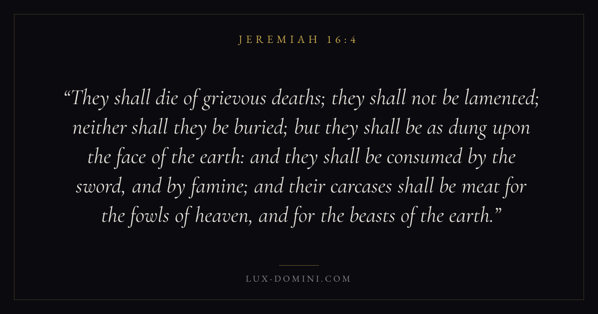 They shall die of grievous deaths; they shall not be lamented; neither shall they be buried; but they shall be as dung upon the face of the earth: and they shall be consumed by the sword, and by famine; and their carcases shall be meat for the fowls of heaven, and for the beasts of the earth.