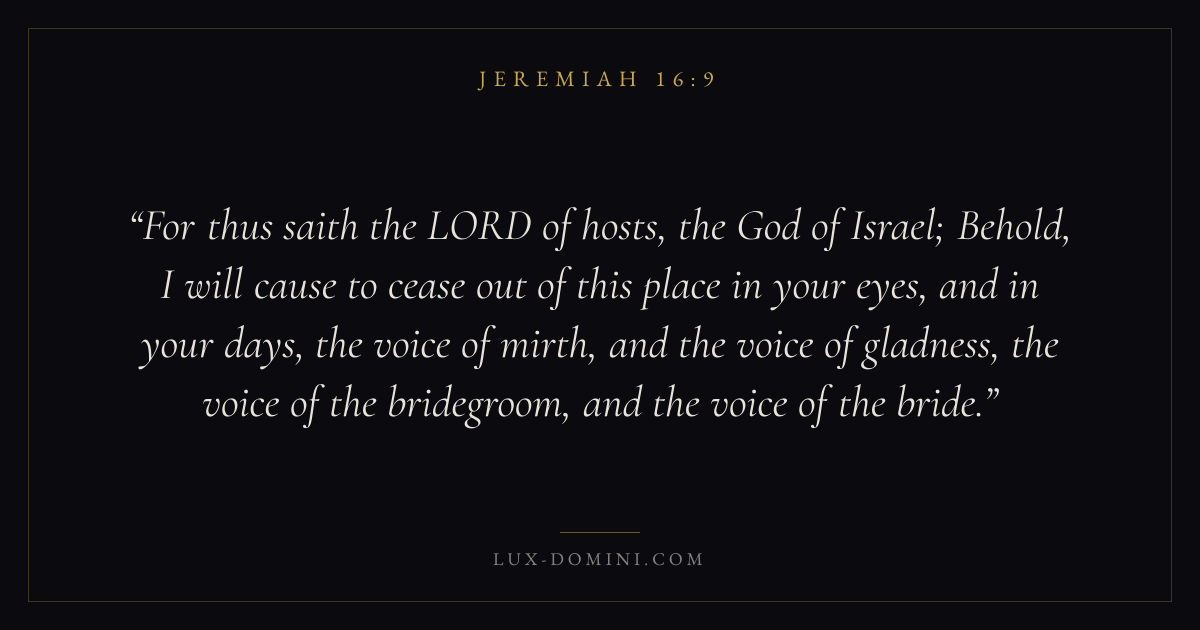 For thus saith the LORD of hosts, the God of Israel; Behold, I will cause to cease out of this place in your eyes, and in your days, the voice of mirth, and the voice of gladness, the voice of the bridegroom, and the voice of the bride.