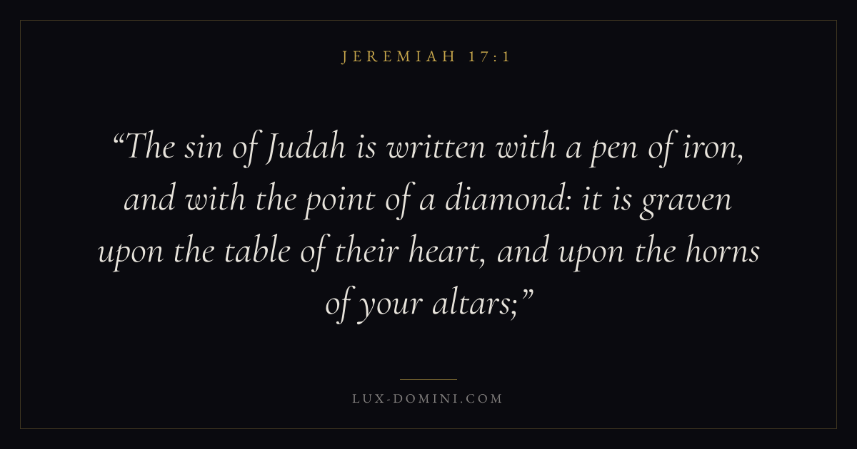 The sin of Judah is written with a pen of iron, and with the point of a diamond: it is graven upon the table of their heart, and upon the horns of your altars;