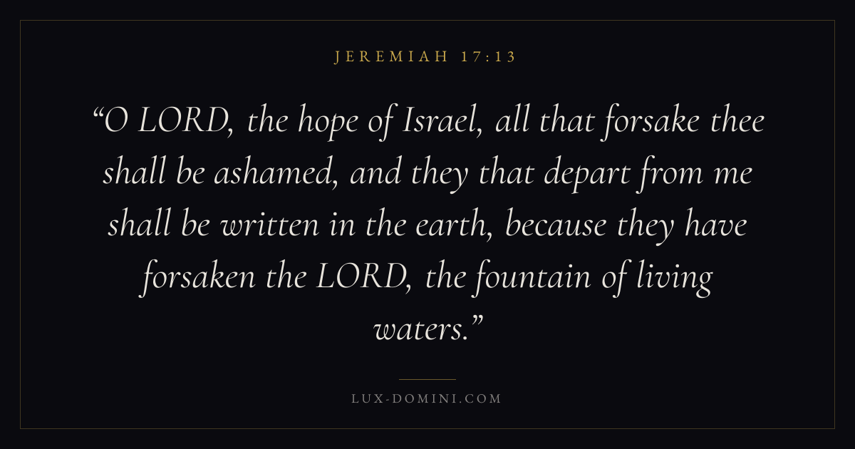 O LORD, the hope of Israel, all that forsake thee shall be ashamed, and they that depart from me shall be written in the earth, because they have forsaken the LORD, the fountain of living waters.