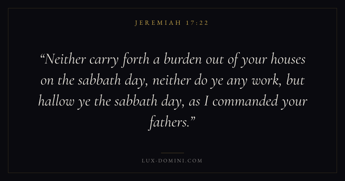 Neither carry forth a burden out of your houses on the sabbath day, neither do ye any work, but hallow ye the sabbath day, as I commanded your fathers.