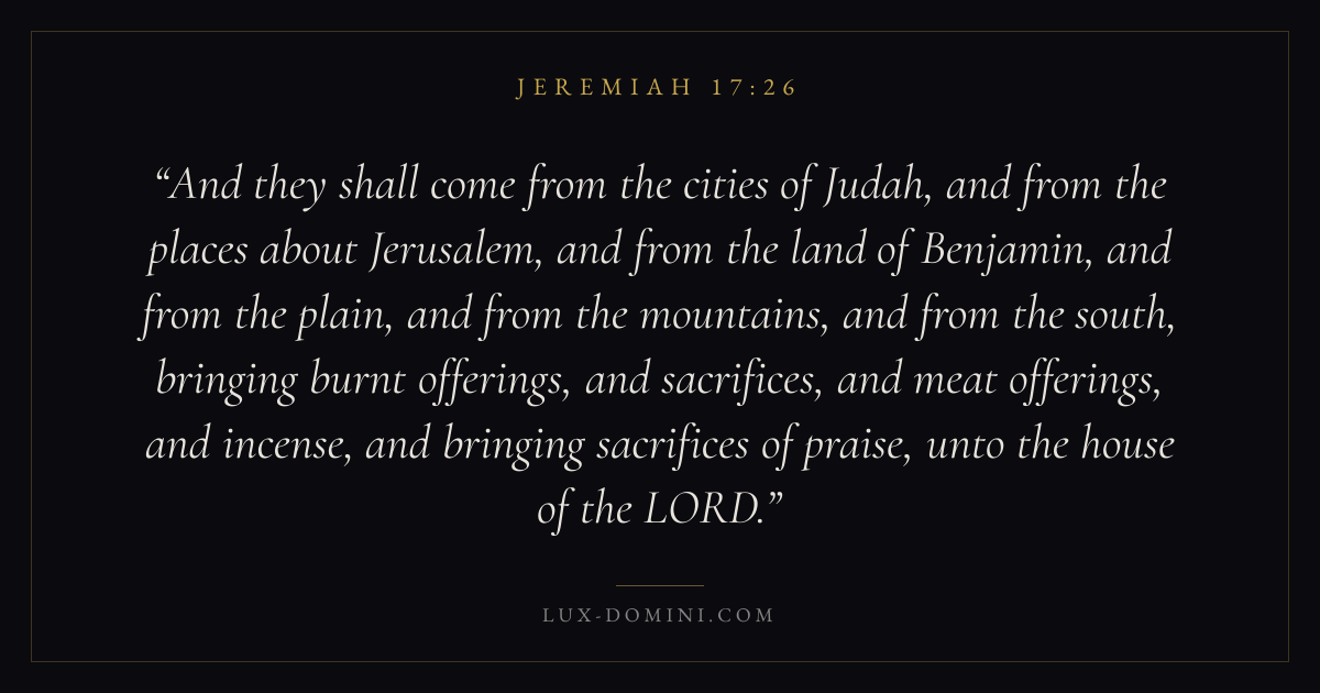 And they shall come from the cities of Judah, and from the places about Jerusalem, and from the land of Benjamin, and from the plain, and from the mountains, and from the south, bringing burnt offerings, and sacrifices, and meat offerings, and incense, and bringing sacrifices of praise, unto the house of the LORD.