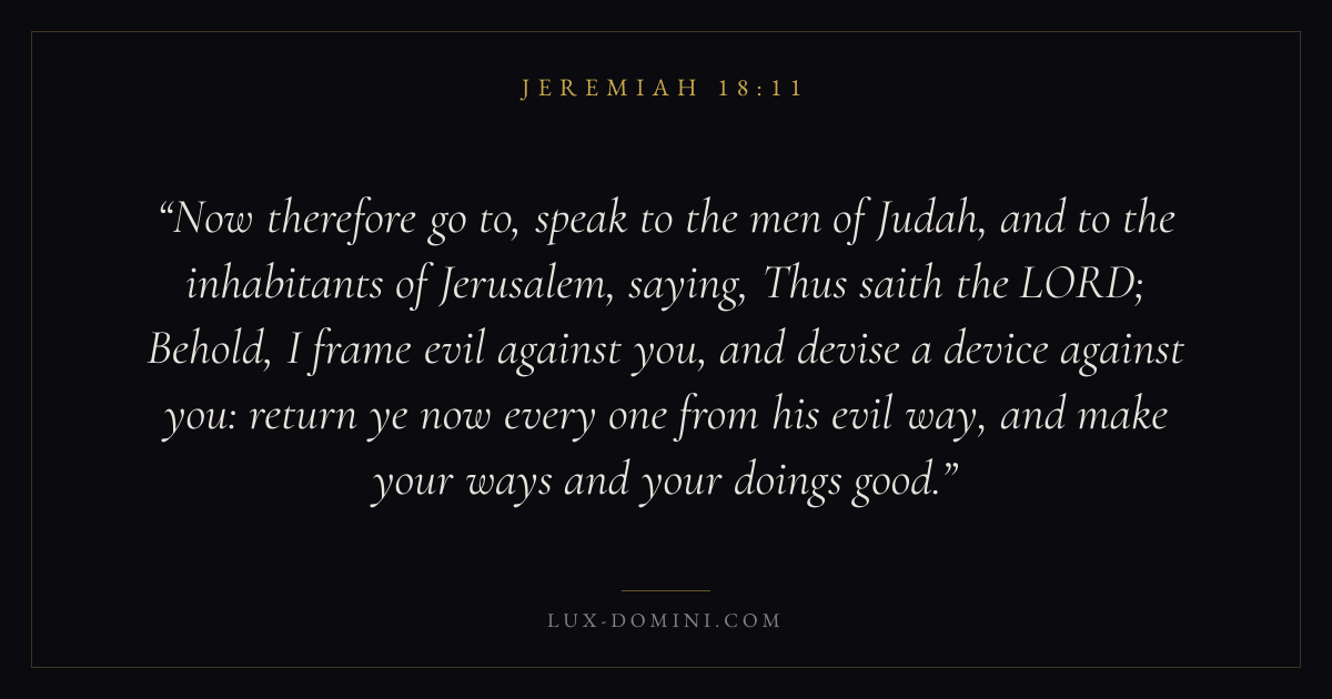 Now therefore go to, speak to the men of Judah, and to the inhabitants of Jerusalem, saying, Thus saith the LORD; Behold, I frame evil against you, and devise a device against you: return ye now every one from his evil way, and make your ways and your doings good.