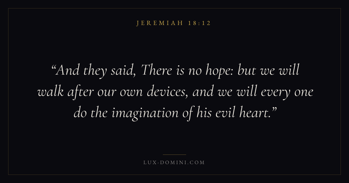 And they said, There is no hope: but we will walk after our own devices, and we will every one do the imagination of his evil heart.