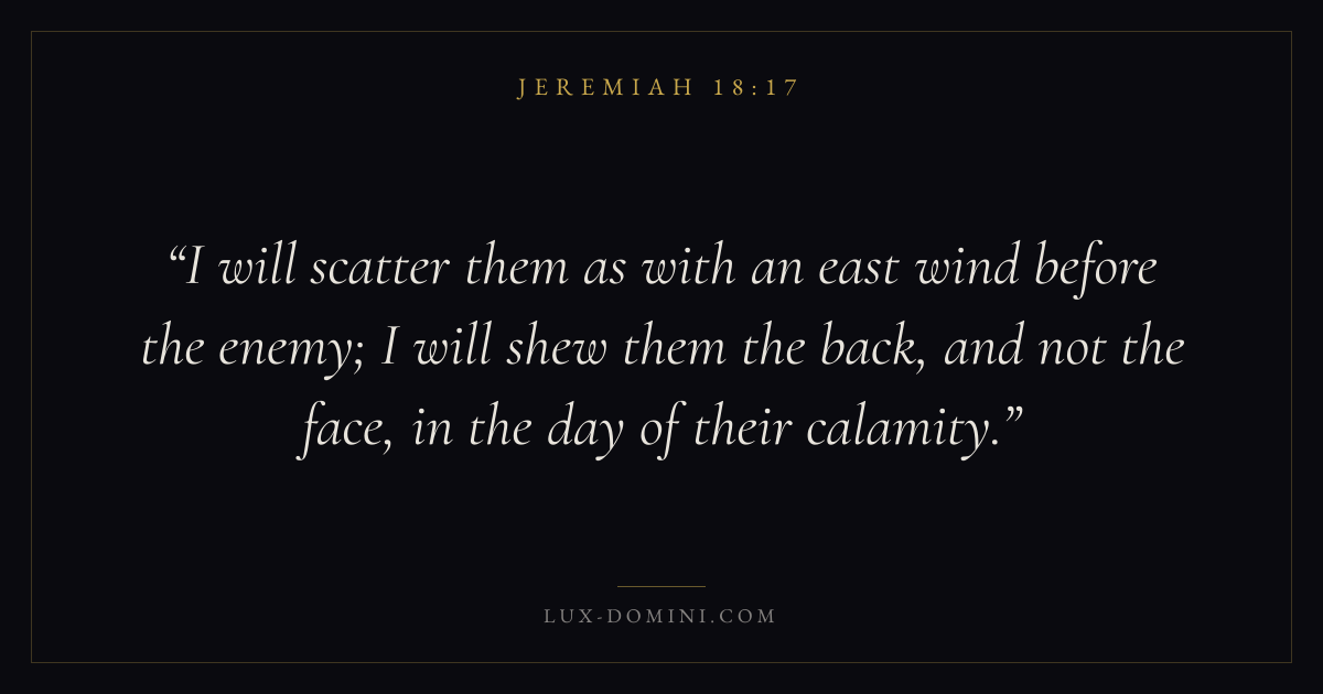 I will scatter them as with an east wind before the enemy; I will shew them the back, and not the face, in the day of their calamity.
