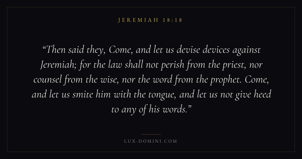 Then said they, Come, and let us devise devices against Jeremiah; for the law shall not perish from the priest, nor counsel from the wise, nor the word from the prophet. Come, and let us smite him with the tongue, and let us not give heed to any of his words.