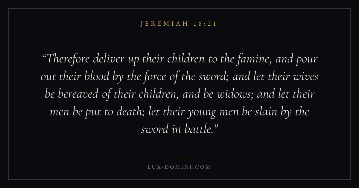 Therefore deliver up their children to the famine, and pour out their blood by the force of the sword; and let their wives be bereaved of their children, and be widows; and let their men be put to death; let their young men be slain by the sword in battle.