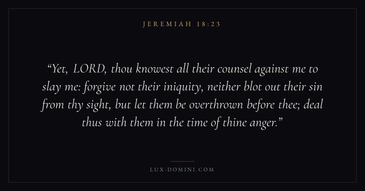 Yet, LORD, thou knowest all their counsel against me to slay me: forgive not their iniquity, neither blot out their sin from thy sight, but let them be overthrown before thee; deal thus with them in the time of thine anger.