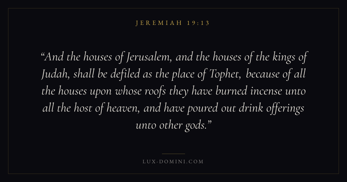 And the houses of Jerusalem, and the houses of the kings of Judah, shall be defiled as the place of Tophet, because of all the houses upon whose roofs they have burned incense unto all the host of heaven, and have poured out drink offerings unto other gods.