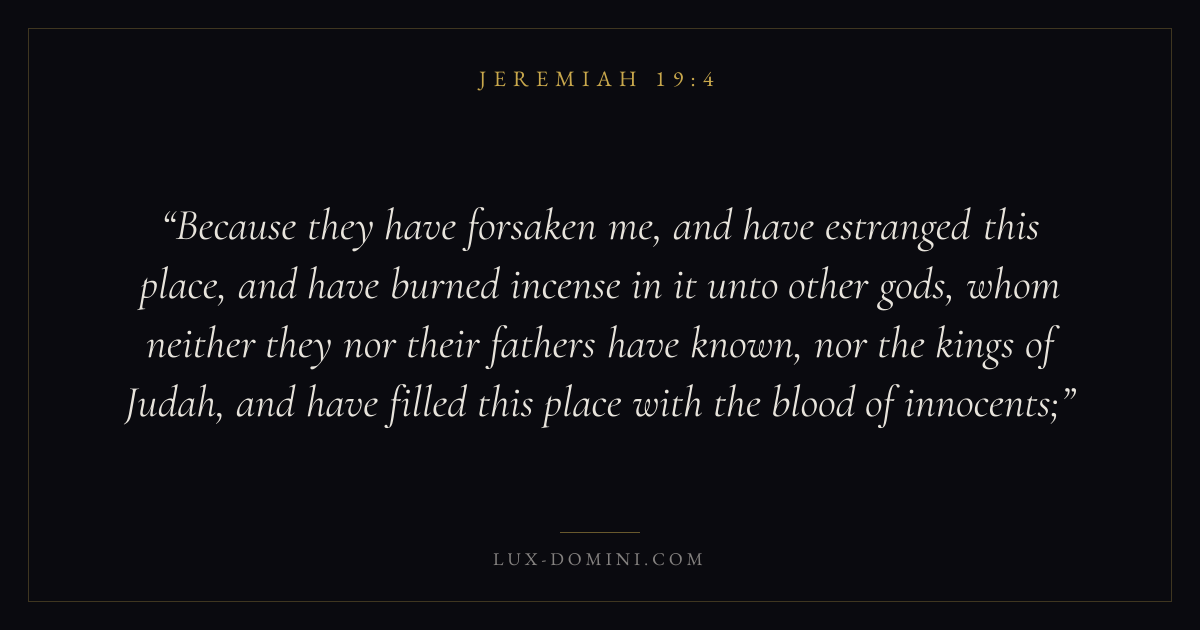 Because they have forsaken me, and have estranged this place, and have burned incense in it unto other gods, whom neither they nor their fathers have known, nor the kings of Judah, and have filled this place with the blood of innocents;