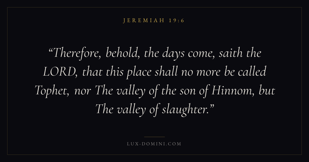 Therefore, behold, the days come, saith the LORD, that this place shall no more be called Tophet, nor The valley of the son of Hinnom, but The valley of slaughter.
