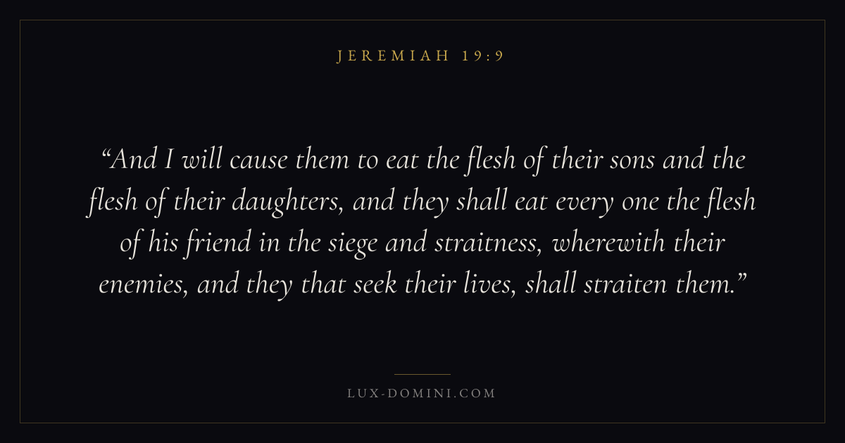 And I will cause them to eat the flesh of their sons and the flesh of their daughters, and they shall eat every one the flesh of his friend in the siege and straitness, wherewith their enemies, and they that seek their lives, shall straiten them.