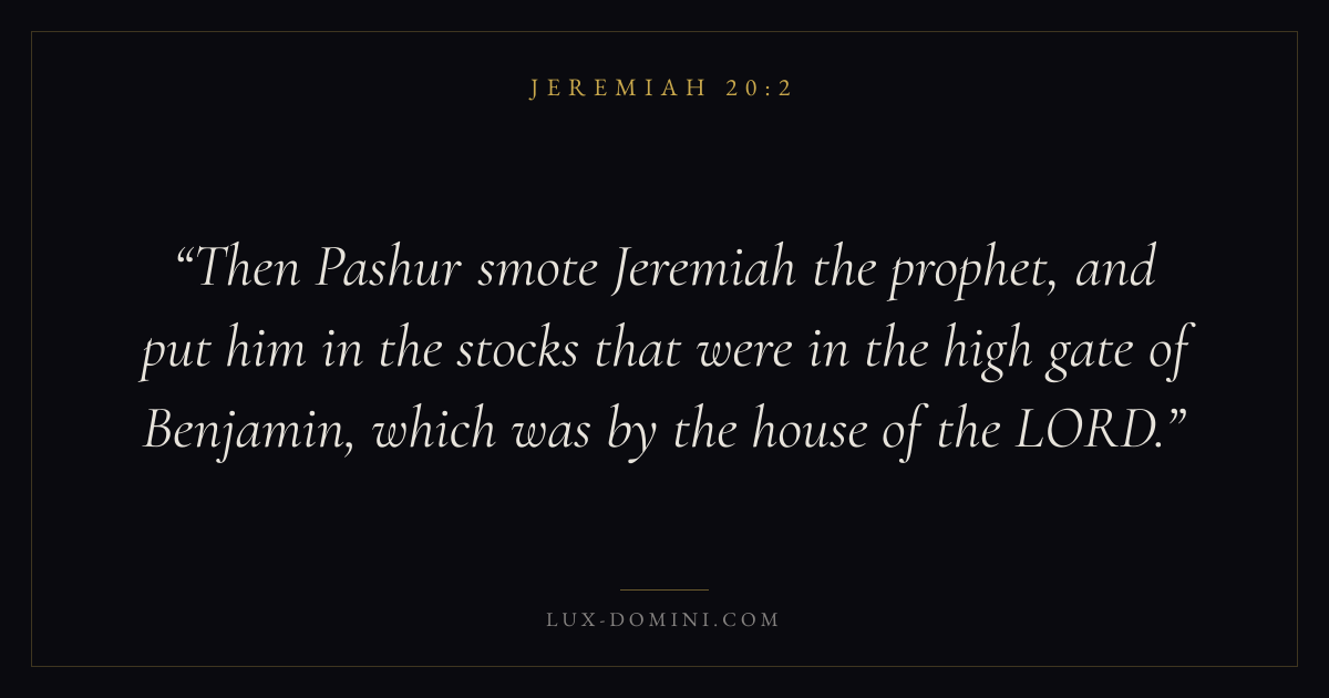 Then Pashur smote Jeremiah the prophet, and put him in the stocks that were in the high gate of Benjamin, which was by the house of the LORD.