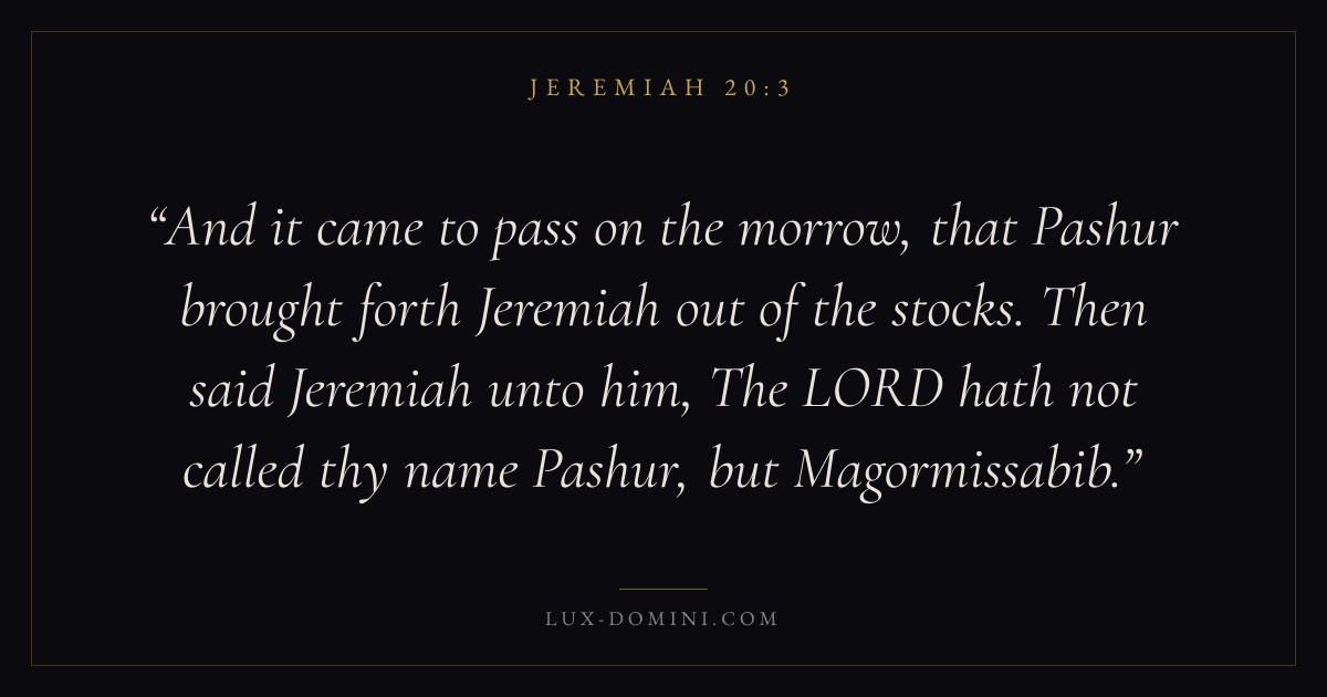 And it came to pass on the morrow, that Pashur brought forth Jeremiah out of the stocks. Then said Jeremiah unto him, The LORD hath not called thy name Pashur, but Magormissabib.