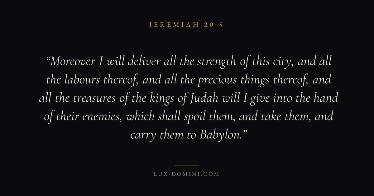 Moreover I will deliver all the strength of this city, and all the labours thereof, and all the precious things thereof, and all the treasures of the kings of Judah will I give into the hand of their enemies, which shall spoil them, and take them, and carry them to Babylon.