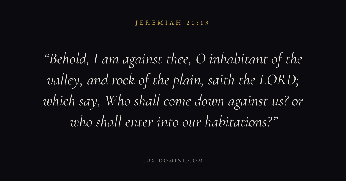 Behold, I am against thee, O inhabitant of the valley, and rock of the plain, saith the LORD; which say, Who shall come down against us? or who shall enter into our habitations?