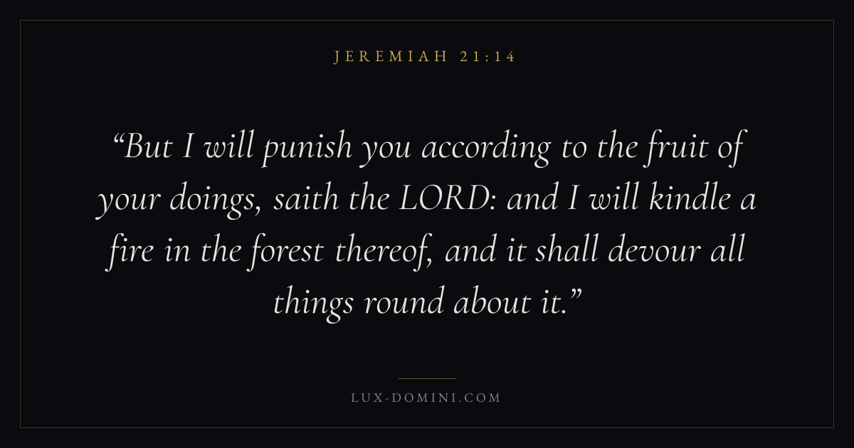 But I will punish you according to the fruit of your doings, saith the LORD: and I will kindle a fire in the forest thereof, and it shall devour all things round about it.