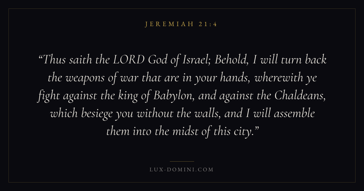 Thus saith the LORD God of Israel; Behold, I will turn back the weapons of war that are in your hands, wherewith ye fight against the king of Babylon, and against the Chaldeans, which besiege you without the walls, and I will assemble them into the midst of this city.