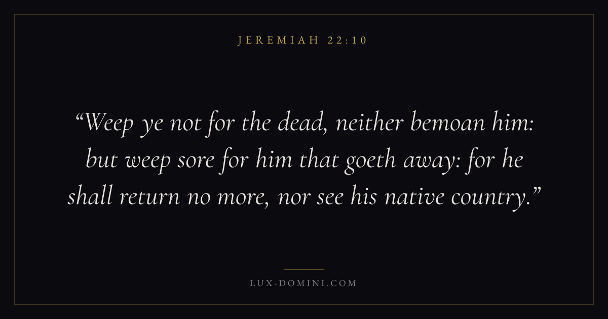 Weep ye not for the dead, neither bemoan him: but weep sore for him that goeth away: for he shall return no more, nor see his native country.