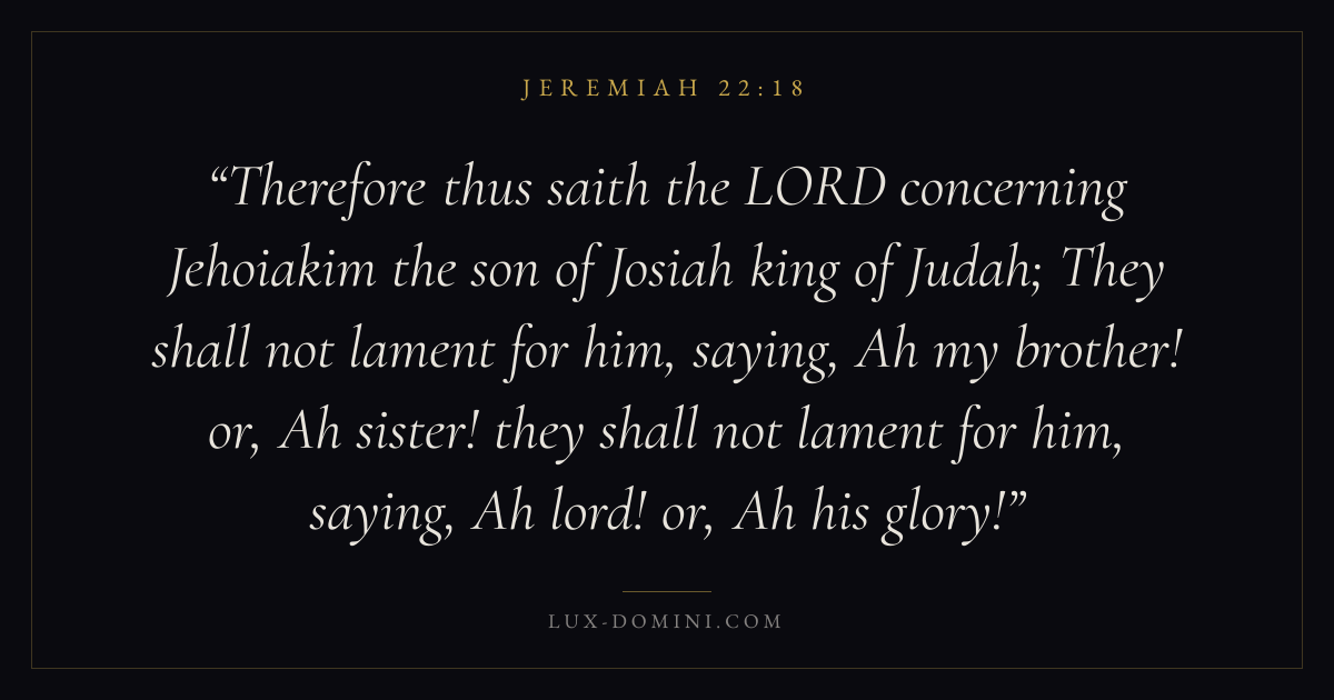 Therefore thus saith the LORD concerning Jehoiakim the son of Josiah king of Judah; They shall not lament for him, saying, Ah my brother! or, Ah sister! they shall not lament for him, saying, Ah lord! or, Ah his glory!