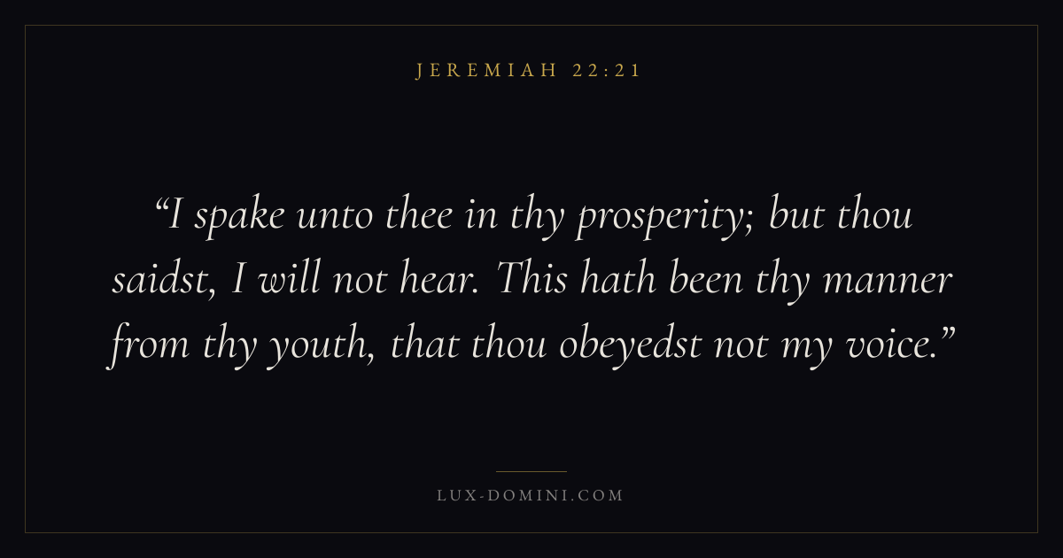 I spake unto thee in thy prosperity; but thou saidst, I will not hear. This hath been thy manner from thy youth, that thou obeyedst not my voice.