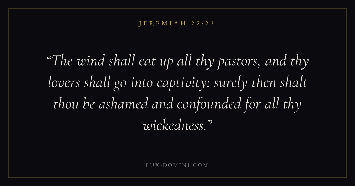 The wind shall eat up all thy pastors, and thy lovers shall go into captivity: surely then shalt thou be ashamed and confounded for all thy wickedness.