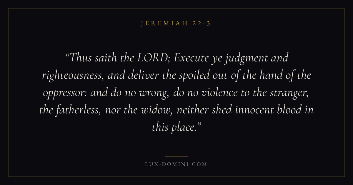 Thus saith the LORD; Execute ye judgment and righteousness, and deliver the spoiled out of the hand of the oppressor: and do no wrong, do no violence to the stranger, the fatherless, nor the widow, neither shed innocent blood in this place.