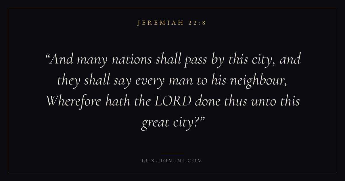 And many nations shall pass by this city, and they shall say every man to his neighbour, Wherefore hath the LORD done thus unto this great city?
