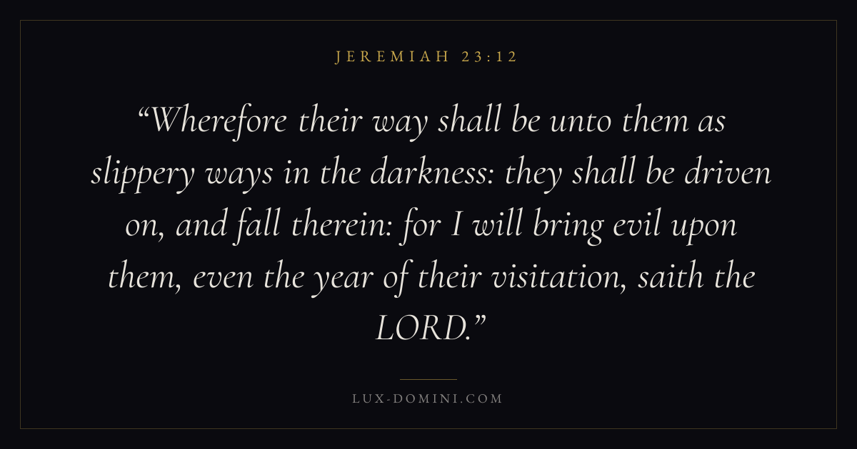 Wherefore their way shall be unto them as slippery ways in the darkness: they shall be driven on, and fall therein: for I will bring evil upon them, even the year of their visitation, saith the LORD.