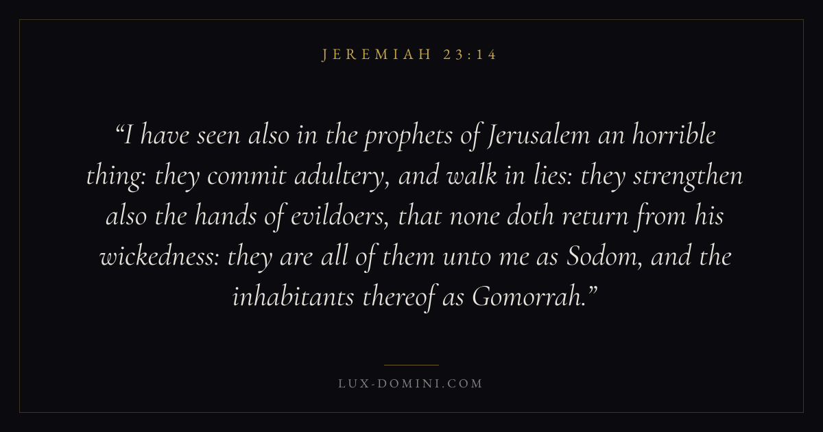 I have seen also in the prophets of Jerusalem an horrible thing: they commit adultery, and walk in lies: they strengthen also the hands of evildoers, that none doth return from his wickedness: they are all of them unto me as Sodom, and the inhabitants thereof as Gomorrah.