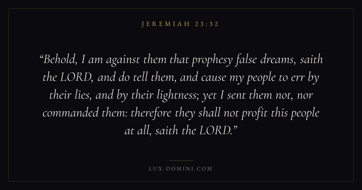 Behold, I am against them that prophesy false dreams, saith the LORD, and do tell them, and cause my people to err by their lies, and by their lightness; yet I sent them not, nor commanded them: therefore they shall not profit this people at all, saith the LORD.