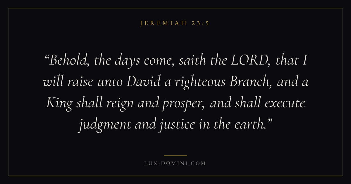 Behold, the days come, saith the LORD, that I will raise unto David a righteous Branch, and a King shall reign and prosper, and shall execute judgment and justice in the earth.