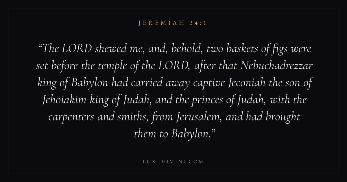 The LORD shewed me, and, behold, two baskets of figs were set before the temple of the LORD, after that Nebuchadrezzar king of Babylon had carried away captive Jeconiah the son of Jehoiakim king of Judah, and the princes of Judah, with the carpenters and smiths, from Jerusalem, and had brought them to Babylon.