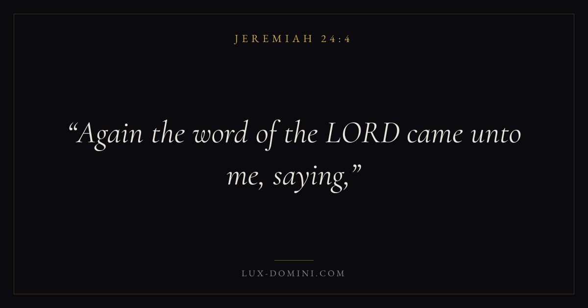 Books / Jeremiah / Chapter 24 / Verse 4 ← Jeremiah 24:3 Jeremiah 24:4 Jeremiah 24:5 → Again the word of the LORD came unto me, saying, Download verse card Share on Twitter Share on Facebook Pin it ✦ Key themes HopeSuffering and trialsJustice and mercyTruthJudgment Read with Jeremiah 24:5Jeremiah 24:6Romans 8:24Revelation 21:4 Related topics Bible verses about hopeBible verses about suffering and trialsBible verses about justice and mercyBible verses about truth ✦ Jeremiah Chapter 24 verses V. 1 V. 2 V. 3 V. 4 V. 5 V. 6 V. 7 V. 8 V. 9 V. 10