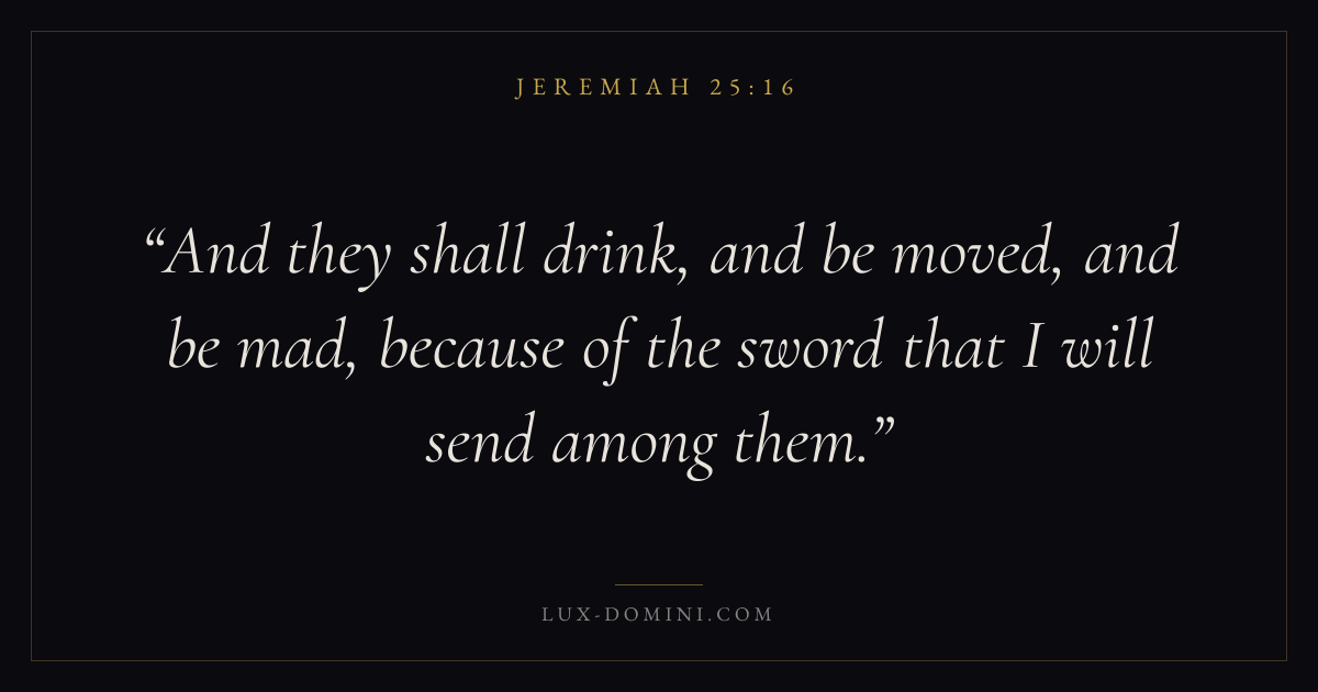And they shall drink, and be moved, and be mad, because of the sword that I will send among them.