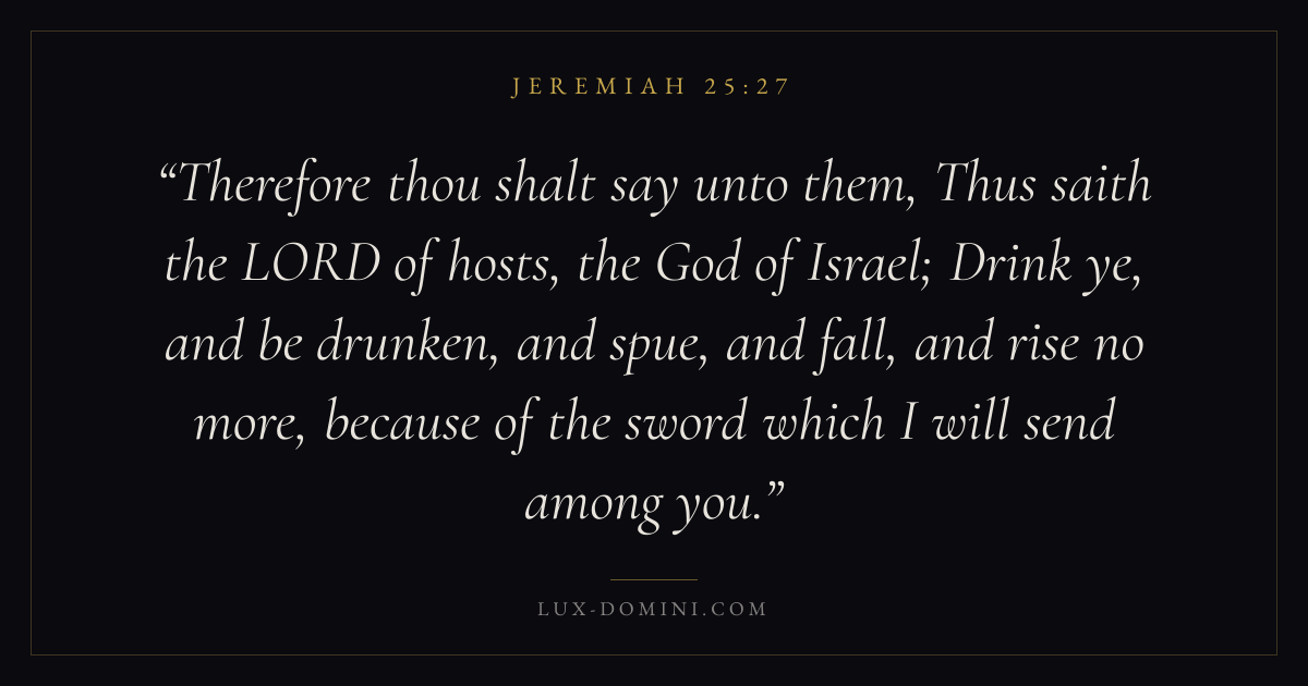 Therefore thou shalt say unto them, Thus saith the LORD of hosts, the God of Israel; Drink ye, and be drunken, and spue, and fall, and rise no more, because of the sword which I will send among you.