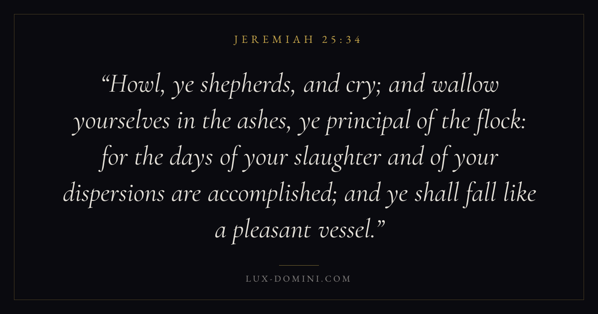 Howl, ye shepherds, and cry; and wallow yourselves in the ashes, ye principal of the flock: for the days of your slaughter and of your dispersions are accomplished; and ye shall fall like a pleasant vessel.