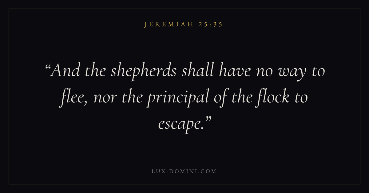 Books / Jeremiah / Chapter 25 / Verse 35 ← Jeremiah 25:34 Jeremiah 25:35 Jeremiah 25:36 → And the shepherds shall have no way to flee, nor the principal of the flock to escape. Download verse card Share on Twitter Share on Facebook Pin it ✦ Key themes HopeSuffering and trialsJustice and mercyJudgment Read with Jeremiah 25:34Jeremiah 25:36Romans 8:24Revelation 21:4 Related topics Bible verses about hopeBible verses about suffering and trialsBible verses about justice and mercy ✦ Jeremiah Chapter 25 verses V. 1 V. 2 V. 3 V. 4 V. 5 V. 6 V. 7 V. 8 V. 9 V. 10 V. 11 V. 12 V. 13 V. 14 V. 15 V. 16 V. 17 V. 18 V. 19 V. 20 V. 21 V. 22 V. 23 V. 24 V. 25 V. 26 V. 27 V. 28 V. 29 V. 30 V. 31 V. 32 V. 33 V. 34 V. 35 V. 36 V. 37 V. 38