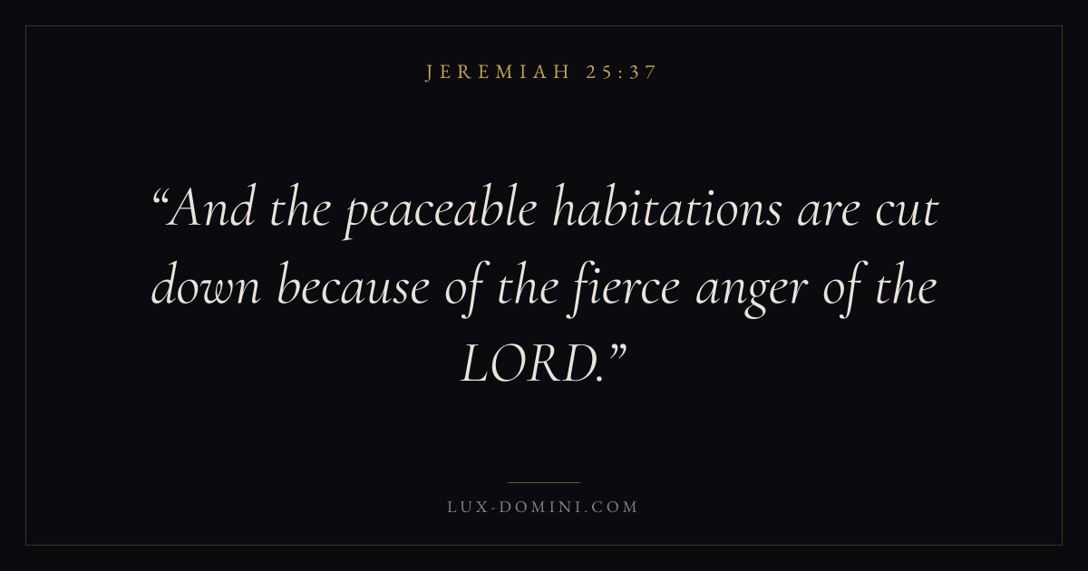 Books / Jeremiah / Chapter 25 / Verse 37 ← Jeremiah 25:36 Jeremiah 25:37 Jeremiah 25:38 → And the peaceable habitations are cut down because of the fierce anger of the LORD. Download verse card Share on Twitter Share on Facebook Pin it ✦ Key themes HopeSuffering and trialsJustice and mercyJudgment Read with Jeremiah 25:34Jeremiah 25:35Romans 8:24Revelation 21:4 Related topics Bible verses about hopeBible verses about suffering and trialsBible verses about justice and mercy ✦ Jeremiah Chapter 25 verses V. 1 V. 2 V. 3 V. 4 V. 5 V. 6 V. 7 V. 8 V. 9 V. 10 V. 11 V. 12 V. 13 V. 14 V. 15 V. 16 V. 17 V. 18 V. 19 V. 20 V. 21 V. 22 V. 23 V. 24 V. 25 V. 26 V. 27 V. 28 V. 29 V. 30 V. 31 V. 32 V. 33 V. 34 V. 35 V. 36 V. 37 V. 38