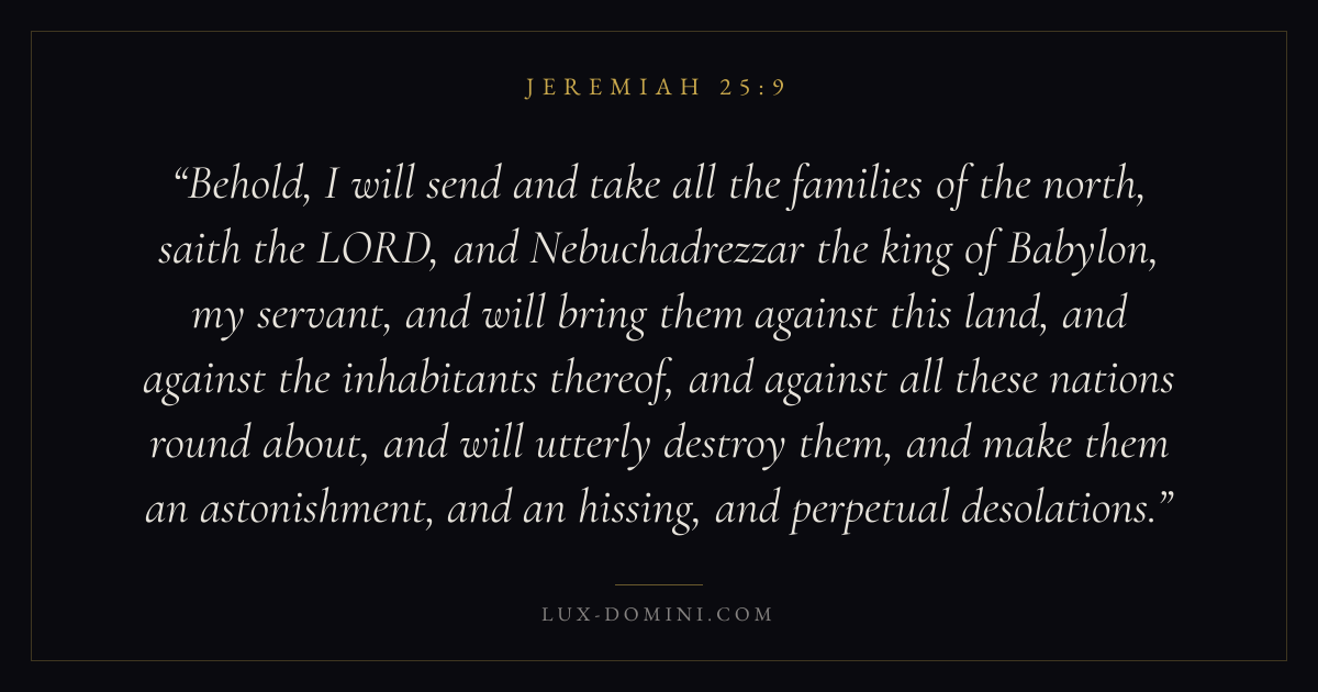 Behold, I will send and take all the families of the north, saith the LORD, and Nebuchadrezzar the king of Babylon, my servant, and will bring them against this land, and against the inhabitants thereof, and against all these nations round about, and will utterly destroy them, and make them an astonishment, and an hissing, and perpetual desolations.