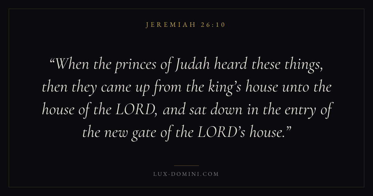 When the princes of Judah heard these things, then they came up from the king’s house unto the house of the LORD, and sat down in the entry of the new gate of the LORD’s house.