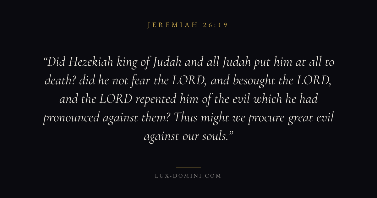 Did Hezekiah king of Judah and all Judah put him at all to death? did he not fear the LORD, and besought the LORD, and the LORD repented him of the evil which he had pronounced against them? Thus might we procure great evil against our souls.