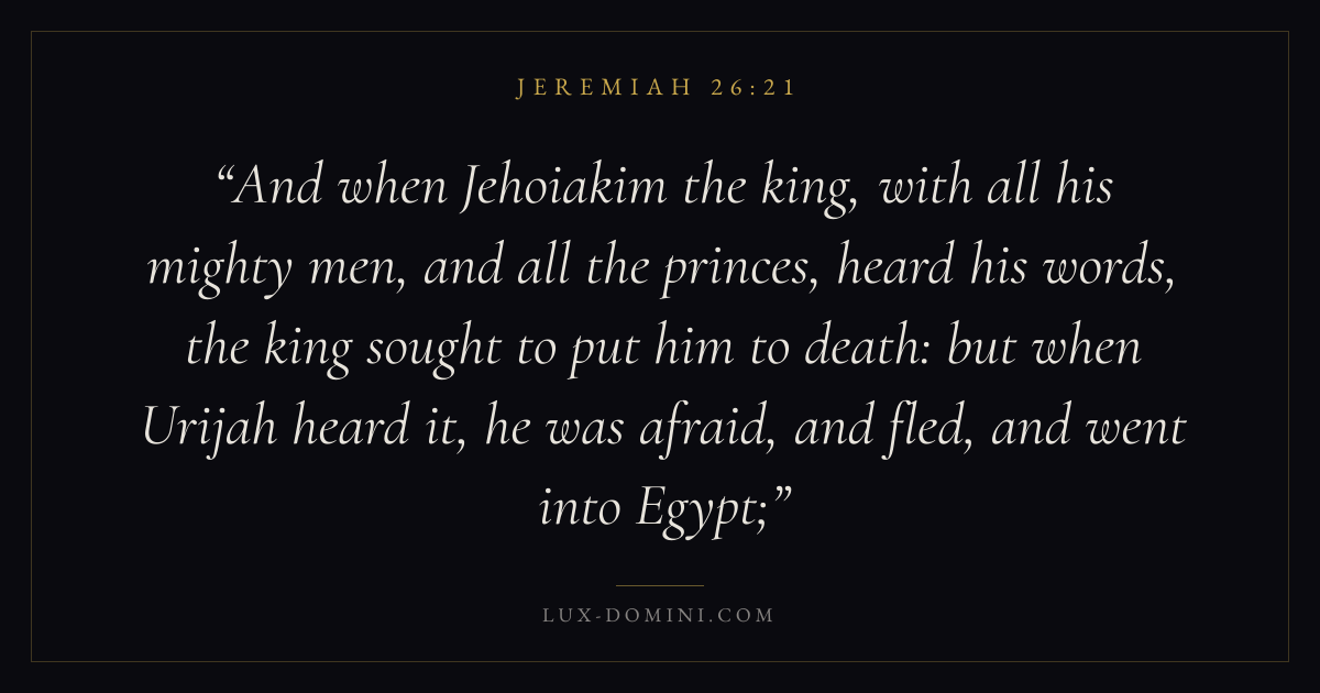 And when Jehoiakim the king, with all his mighty men, and all the princes, heard his words, the king sought to put him to death: but when Urijah heard it, he was afraid, and fled, and went into Egypt;