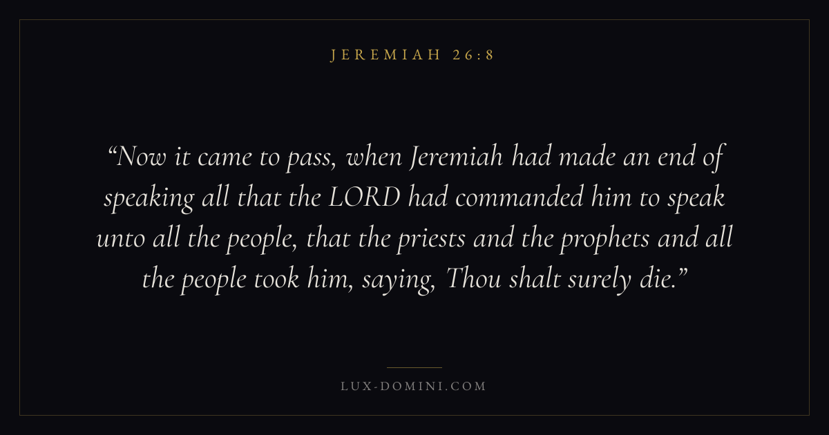 Now it came to pass, when Jeremiah had made an end of speaking all that the LORD had commanded him to speak unto all the people, that the priests and the prophets and all the people took him, saying, Thou shalt surely die.
