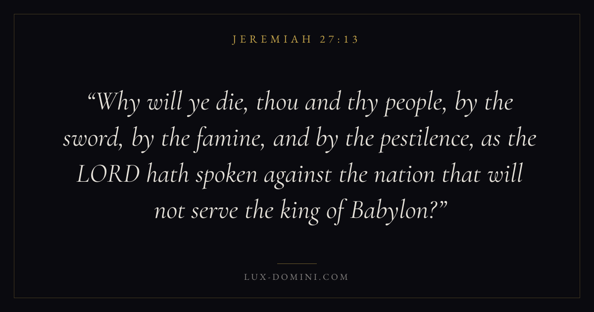 Why will ye die, thou and thy people, by the sword, by the famine, and by the pestilence, as the LORD hath spoken against the nation that will not serve the king of Babylon?