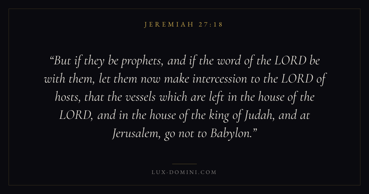 But if they be prophets, and if the word of the LORD be with them, let them now make intercession to the LORD of hosts, that the vessels which are left in the house of the LORD, and in the house of the king of Judah, and at Jerusalem, go not to Babylon.