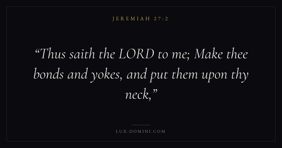 Books / Jeremiah / Chapter 27 / Verse 2 ← Jeremiah 27:1 Jeremiah 27:2 Jeremiah 27:3 → Thus saith the LORD to me; Make thee bonds and yokes, and put them upon thy neck, Download verse card Share on Twitter Share on Facebook Pin it ✦ Key themes HopeSuffering and trialsJustice and mercyJudgment Read with Jeremiah 27:1Jeremiah 27:3Romans 8:24Revelation 21:4 Related topics Bible verses about hopeBible verses about suffering and trialsBible verses about justice and mercy ✦ Jeremiah Chapter 27 verses V. 1 V. 2 V. 3 V. 4 V. 5 V. 6 V. 7 V. 8 V. 9 V. 10 V. 11 V. 12 V. 13 V. 14 V. 15 V. 16 V. 17 V. 18 V. 19 V. 20 V. 21 V. 22