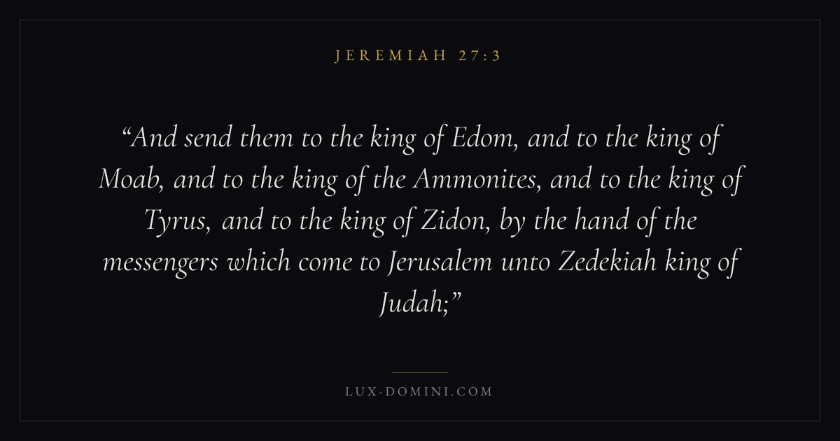 And send them to the king of Edom, and to the king of Moab, and to the king of the Ammonites, and to the king of Tyrus, and to the king of Zidon, by the hand of the messengers which come to Jerusalem unto Zedekiah king of Judah;