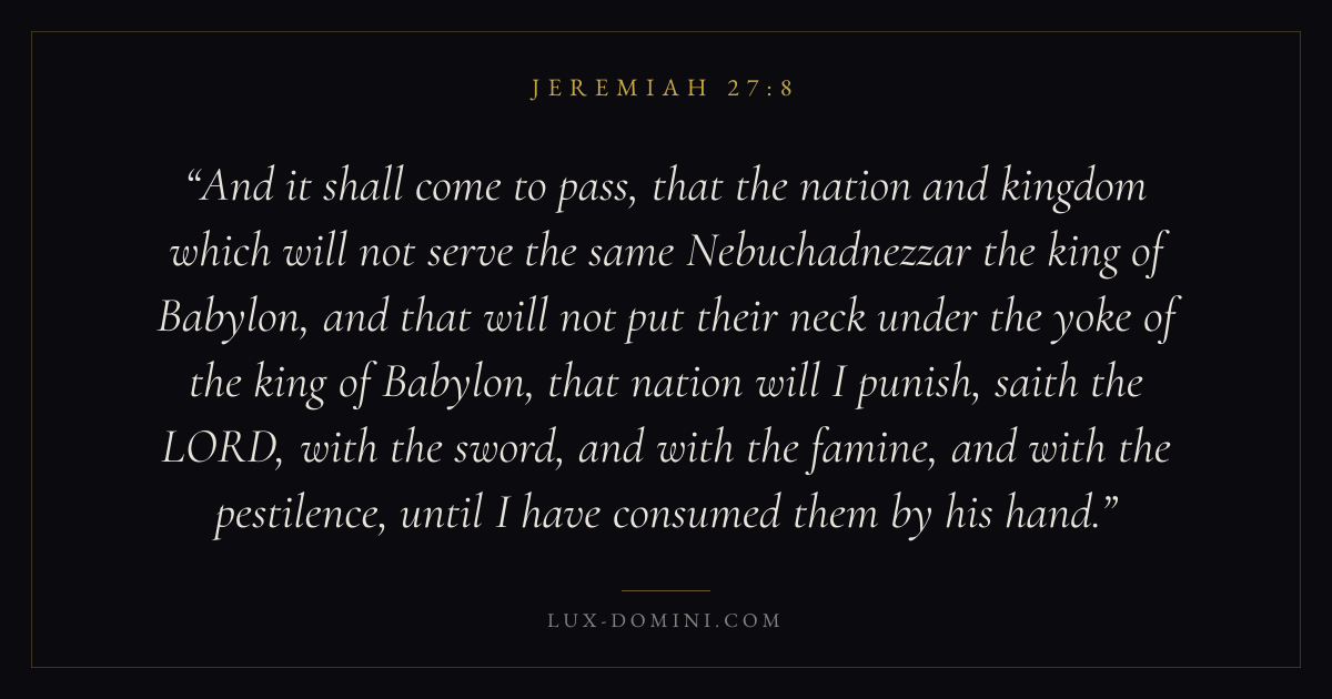 And it shall come to pass, that the nation and kingdom which will not serve the same Nebuchadnezzar the king of Babylon, and that will not put their neck under the yoke of the king of Babylon, that nation will I punish, saith the LORD, with the sword, and with the famine, and with the pestilence, until I have consumed them by his hand.