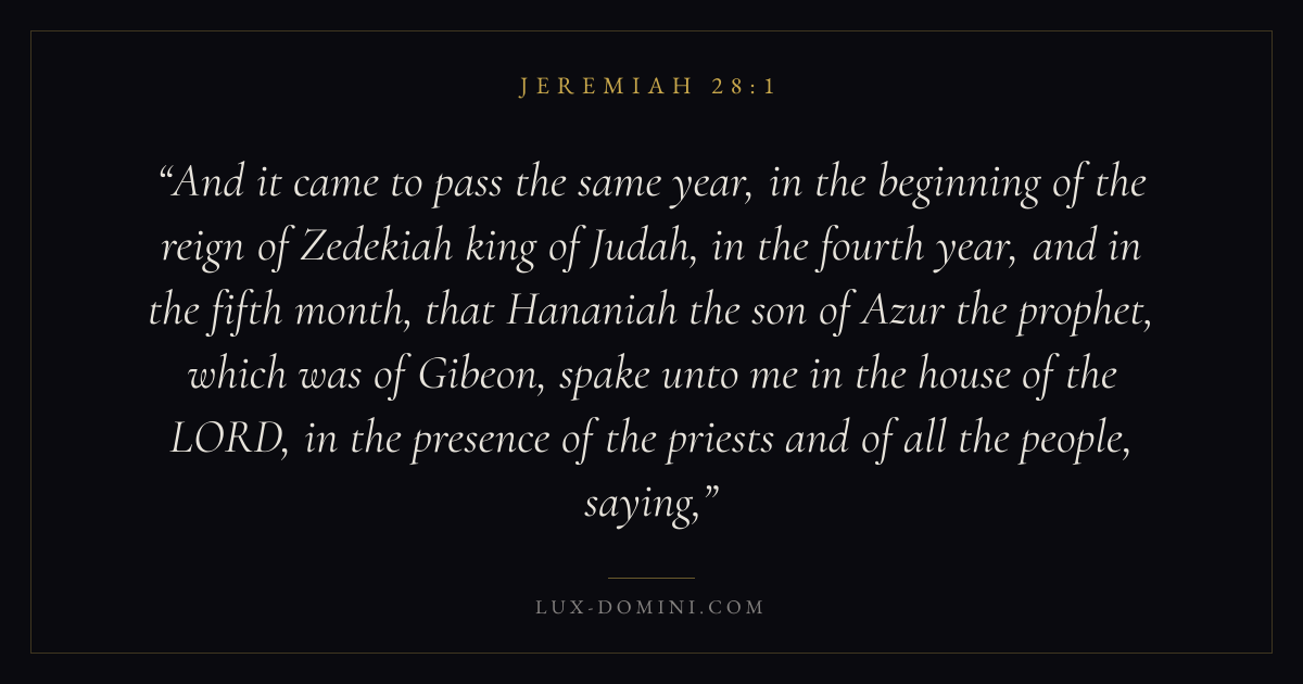 And it came to pass the same year, in the beginning of the reign of Zedekiah king of Judah, in the fourth year, and in the fifth month, that Hananiah the son of Azur the prophet, which was of Gibeon, spake unto me in the house of the LORD, in the presence of the priests and of all the people, saying,